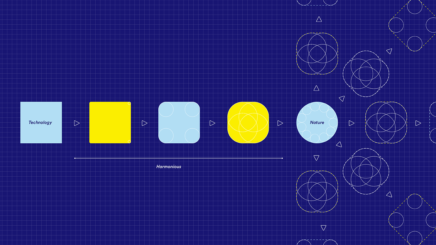 来訪者が最初に触れる体験として、新しいオフィスの設計を担当したYOHAKの鹿野氏のチームと協業しながらオフィス設計コンセプトの背景にあった経営者の思想を抽出し、都市の真ん中であえて自然をふんだんに取り入れた「秩序と自然の循環」を抽象的なモーショングラフィックデザインと環境音楽を軸にした映像表現として構築しています。