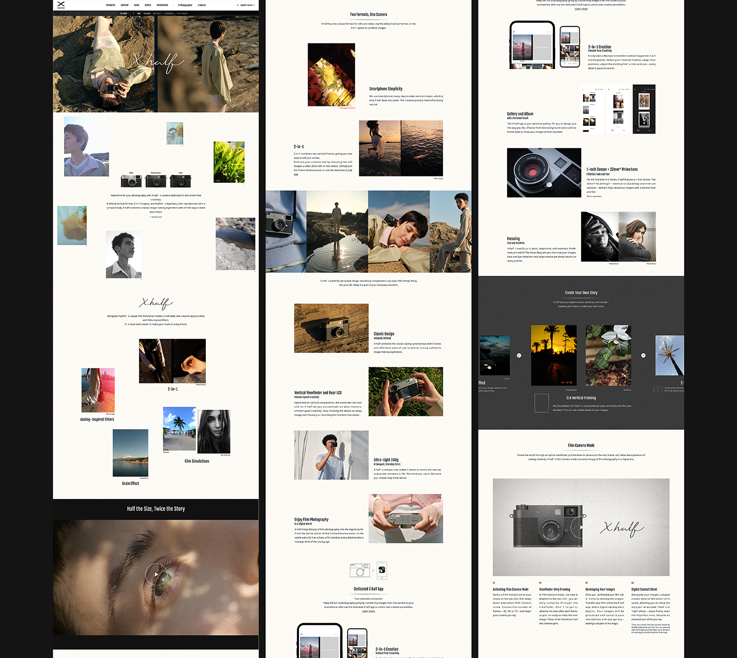 ブランドサイトでは、世界観を丁寧に届けることを軸に、X halfで実際に撮影した写真がスクロールに合わせて広がっていく演出を取り入れました。X halfがもたらす自由な撮影体験や、使う人のクリエイティビティを自然に引き出してくれる感覚を、視覚的に感じてもらえるよう設計しています。